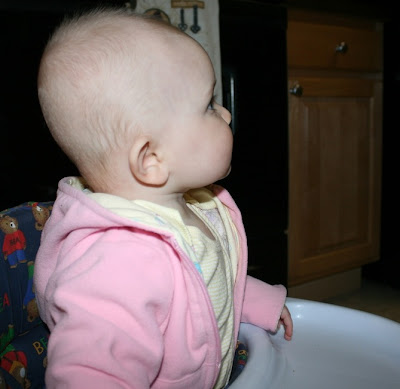 Claire is now 8 months old, and has been changing a lot. She loves to explore the world around her, and seems pretty smart and able to grasp new tasks quickly. She is now infatuated with walking. Before she would want to be carried around, now she wants to be walked around. She also holds herself up on the coffee table and couch. She says mama a lot and is experimenting with her voice ( it seems her favorite is a whimpering sound now). She still loves public places, and gets really excited and babbles a lot while we are out. No teeth yet but she continues drool and chew on everything.